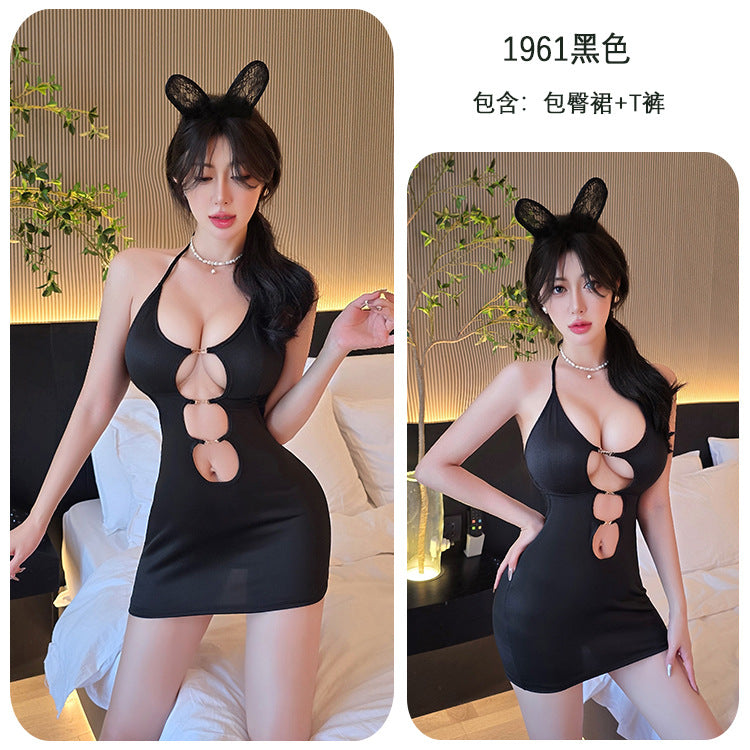 【A-1961】情趣內衣豹紋緊身包臀裙誘惑約會戰袍掛脖吊帶睡衣女睡衣睡裙