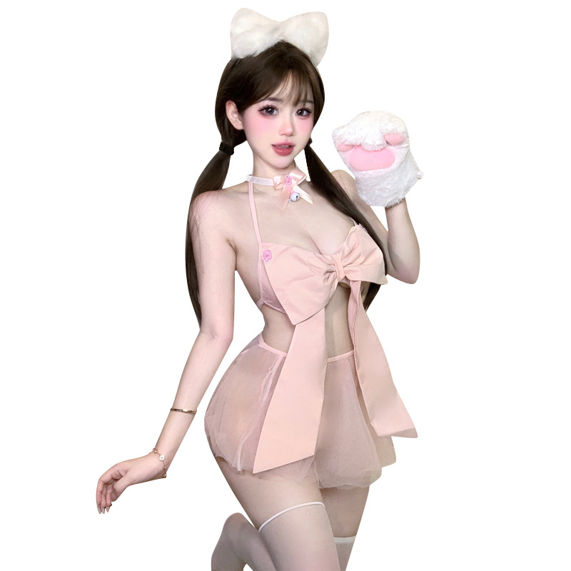BS8236-性感情趣內衣粉色蝴蝶結三點式純欲誘惑拼接網紗透視套裝女睡衣睡裙