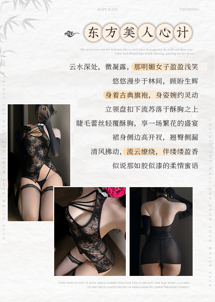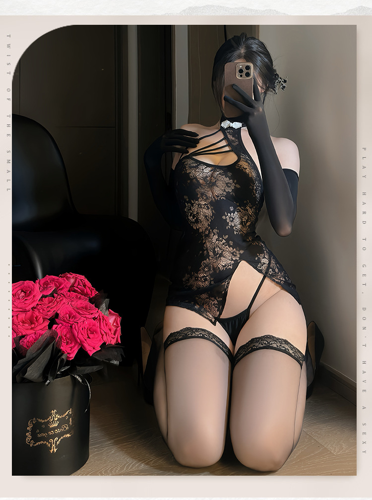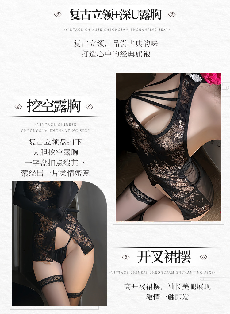 BT2155-性感純欲蕾絲旗袍制服情趣內衣側邊綁帶透視睡裙免脫套裝女睡衣睡裙