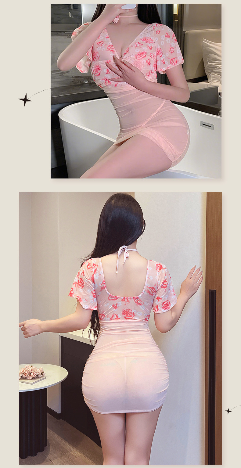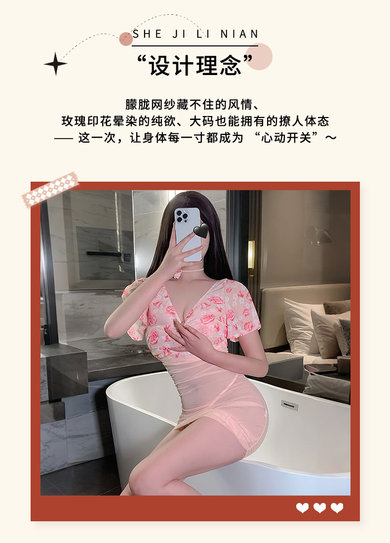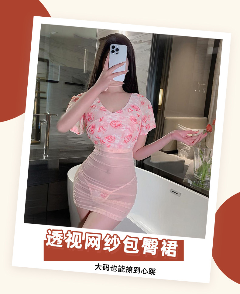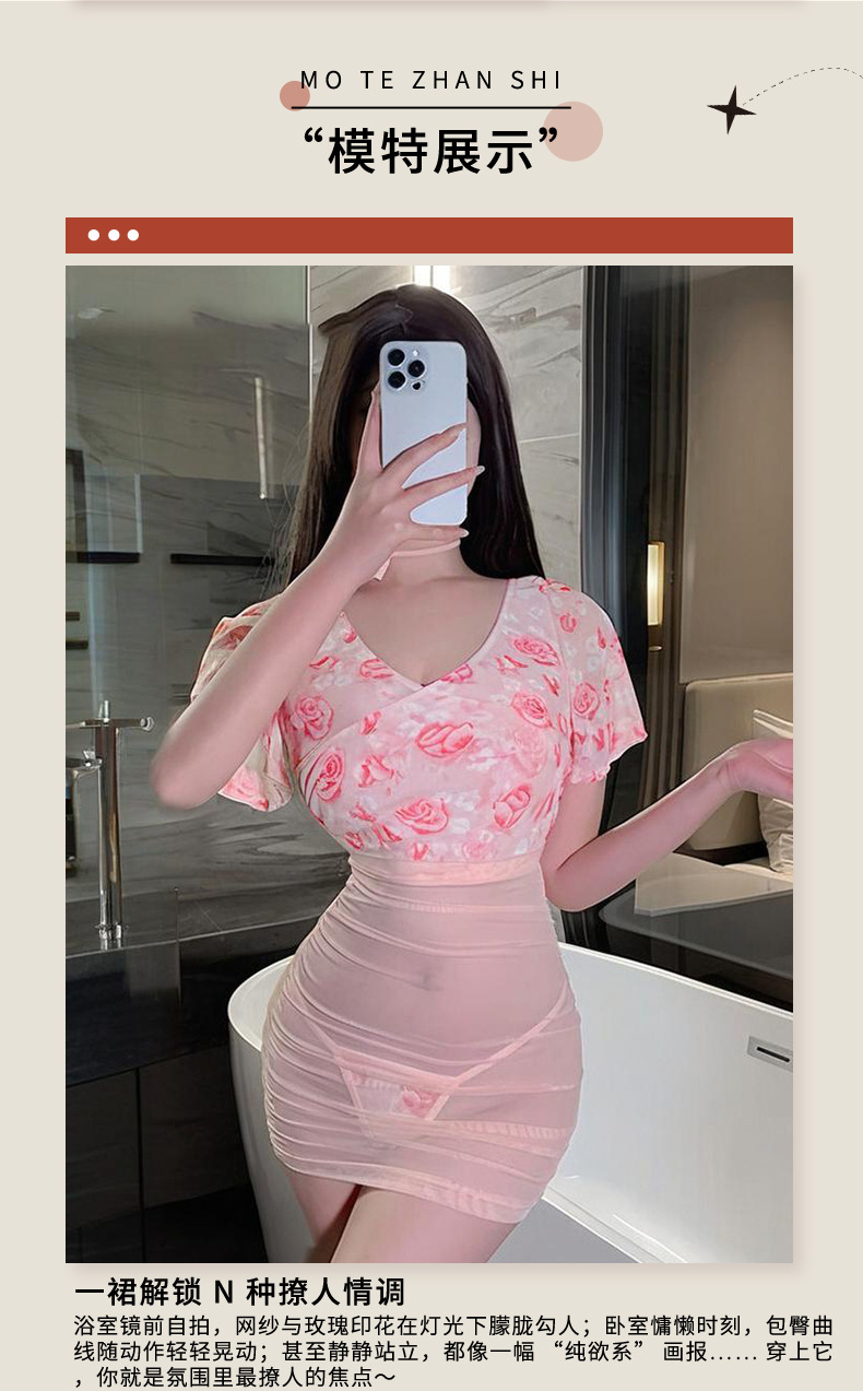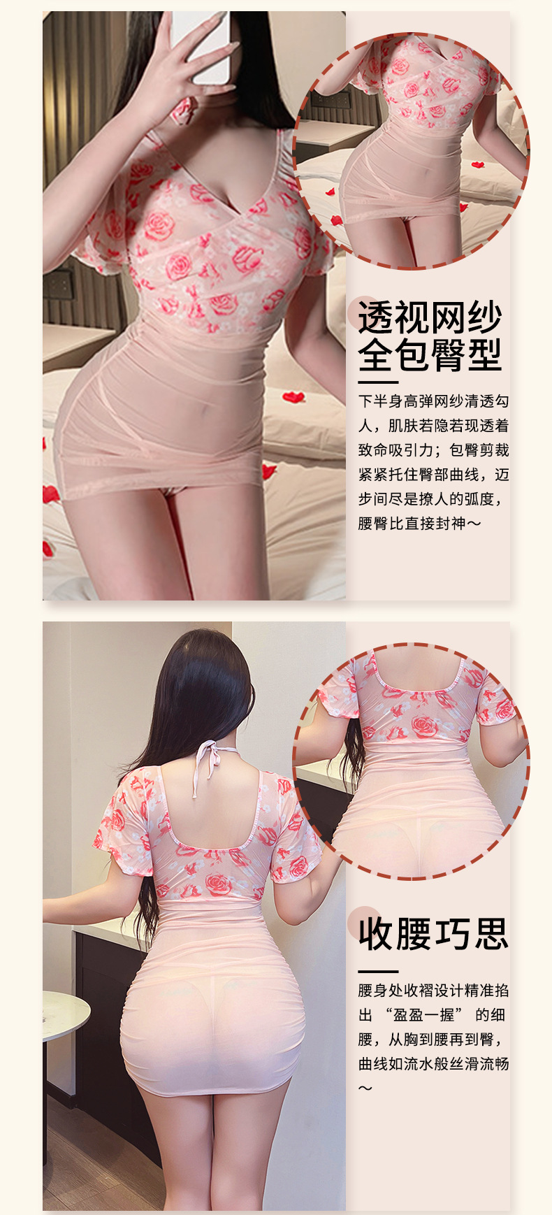 CS548-大碼情趣內衣性感透視深V玫瑰輕紗包臀裙純欲風禁欲系情調睡衣女睡衣睡裙